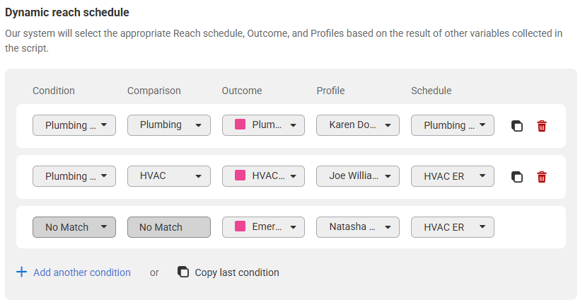 - Comparison: Depending on the Condition you've set, you'll need to add your Comparisons accordingly. For example, since we want our Reach schedule to change based on if the customer is calling for Plumbing or HVAC, we'll need to add two Comparisons; one for Plumbing and one for HVAC.