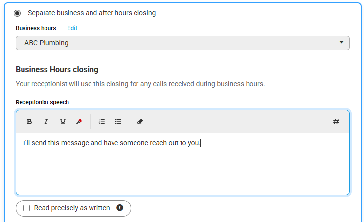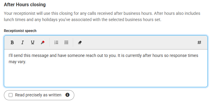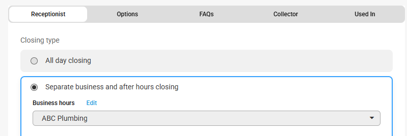 Business and after-hours closings will display different closing text to agents depending on what day or time a customer calls in.