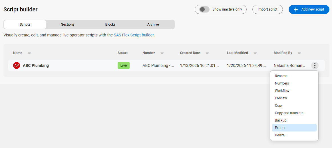 On the main Scripts page, locate the script you wish to export. Click the 3-dot menu icon associated with that script and click Export.