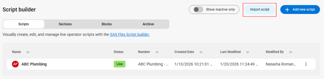 On the main Scripts page, click the Import script button along the banner on the right-hand side.