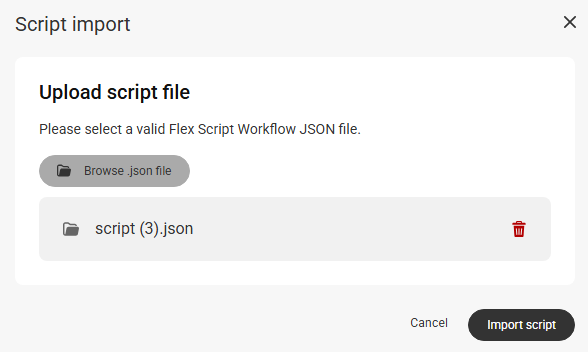 In the pop-up window, click Browse .json file to locate and select the previously exported script from your computer. Then click Import script.