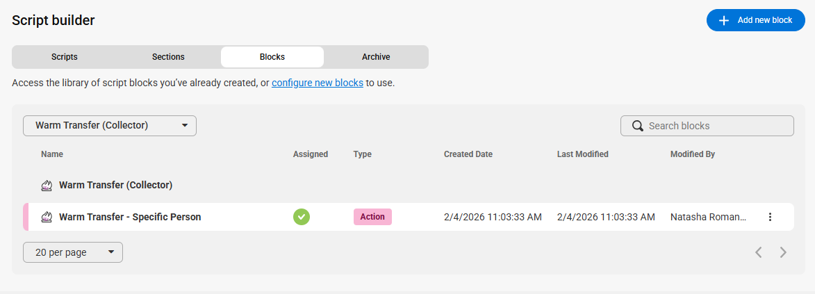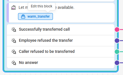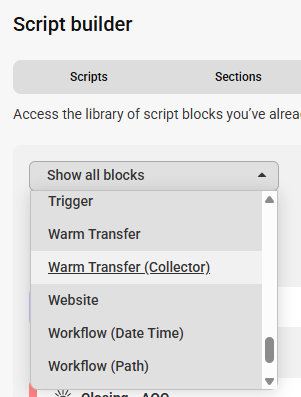 While you can locate and update Warm Transfer (Collector) blocks via the script workflow as shown above, it can be difficult to differentiate between Warm Transfer and Warm Transfer (Collector) blocks as they have the same field name. So, we'll show you another way to easily locate & update blocks within your script.