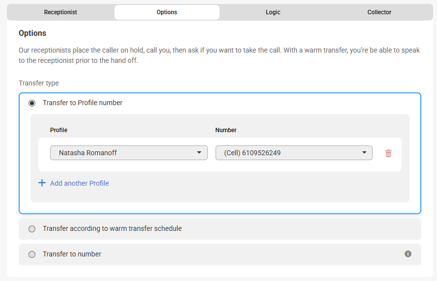 - The Transfer to Profile number option will transfer calls to a specific Profile. You can either replace the current Profile with another using the Profile and Number drop downs, or you can add another Profile to create a secondary warm transfer if the first contact doesn't answer. If you need to change the Profile number itself, you must do that through the Profile page.
