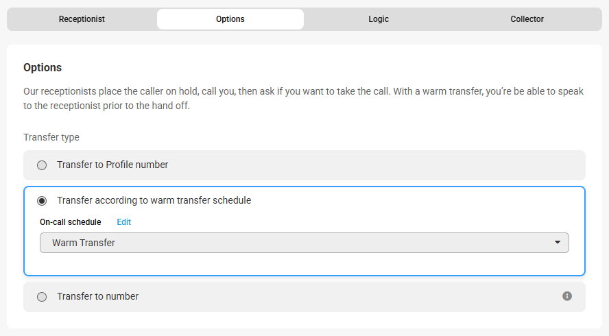 - The Transfer according to warm transfer schedule option will transfer calls based on the Warm Transfer schedule selected. You can select a different Warm Transfer schedule via the On-call schedule drop down. If you need to change the Warm Transfer schedule itself, you must do that through the On-Call page.