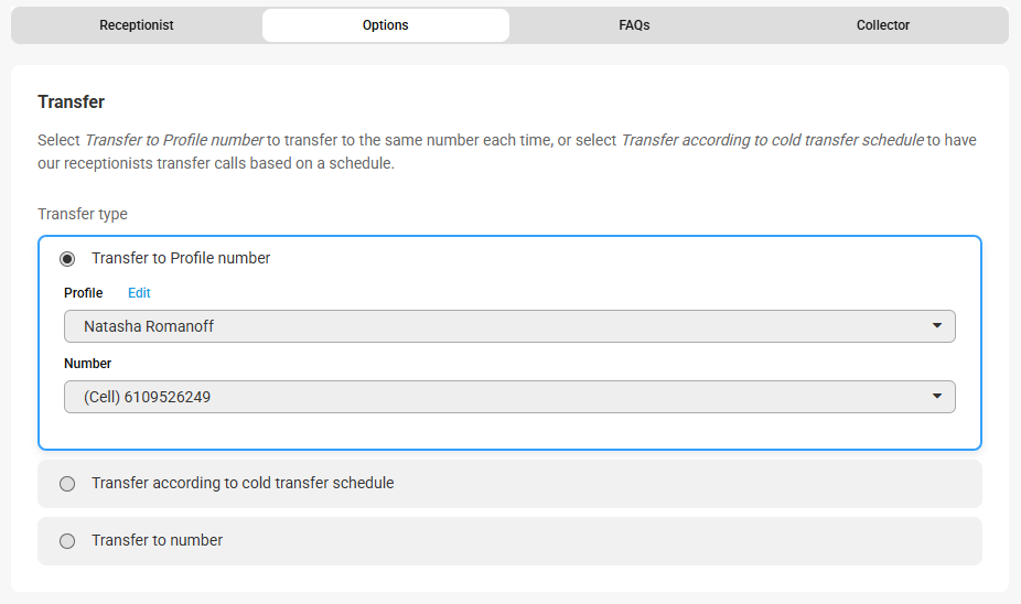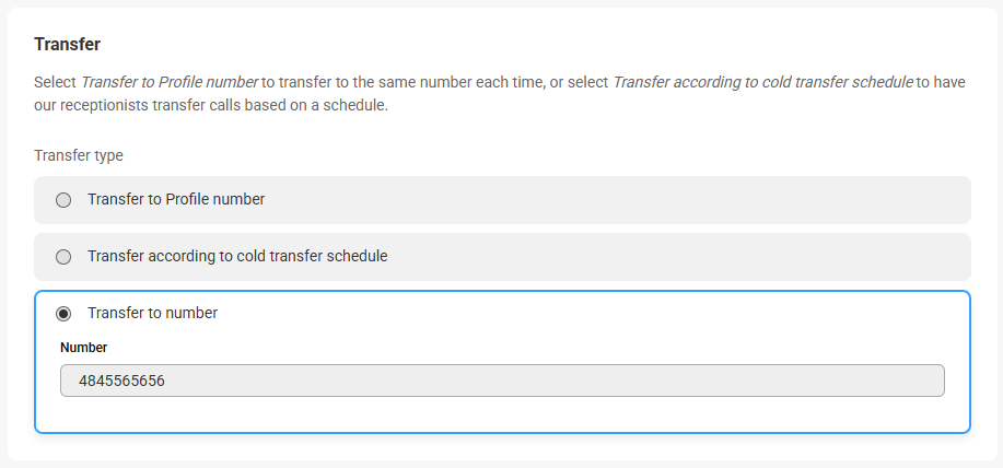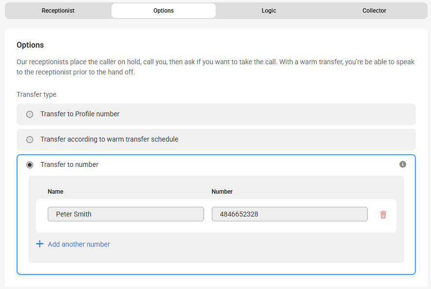 - The Transfer to number option will transfer calls to the number listed. You can either update the name and number directly from this page, or add a secondary warm transfer contact if the first contact doesn't answer.