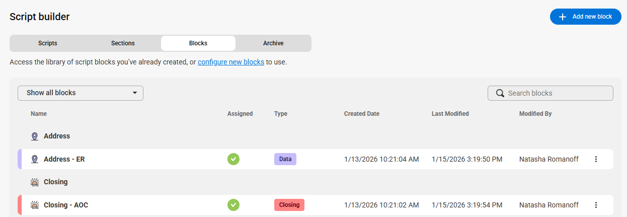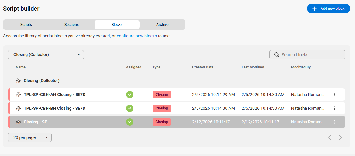 While you can locate and update Closing (Collector) blocks via the script workflow as shown above, it can be difficult to differentiate between Closing and Closing (Collector) blocks as they have the same field name. So, we'll show you another way to easily locate & update blocks within your script.