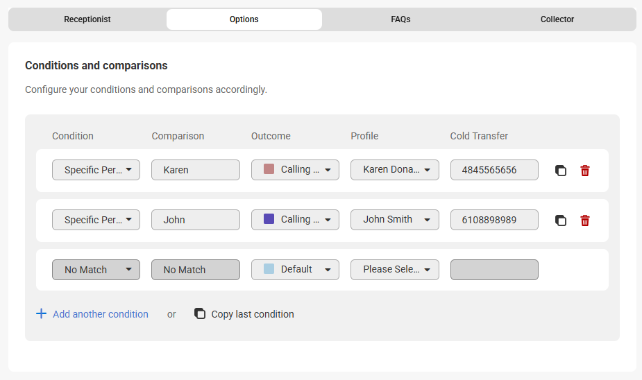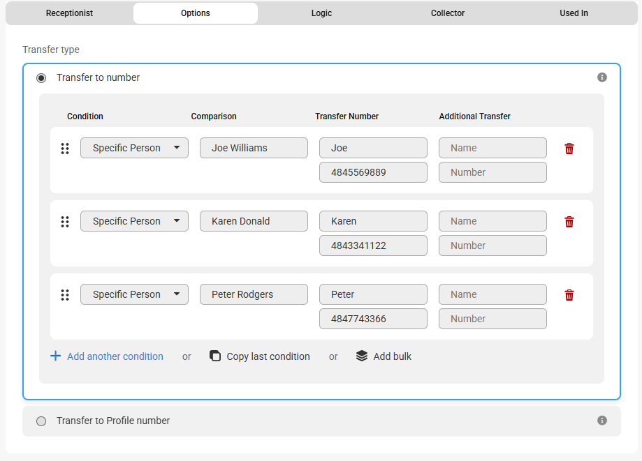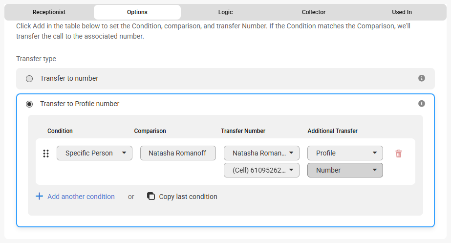 - The Transfer to number option will transfer calls to the number listed based on a condition and comparison. You can either update the name and number directly from this page, or add a secondary warm transfer contact if the first contact doesn't answer. You can also update the Conditions and Comparisons in this section if needed.