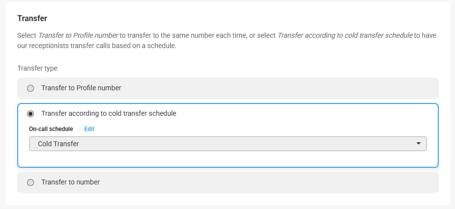 - The Transfer according to cold transfer schedule option will transfer calls based on the Cold Transfer schedule selected. You can select a different Cold Transfer schedule via the On-call schedule drop down. If you need to change the Cold Transfer schedule itself, you must do that through the On-Call page.