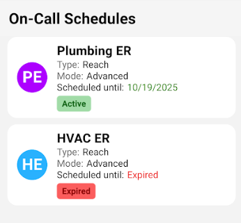 On the next screen, you'll see all current on-call schedules. Expired schedules will display a red "Expired" tag, as shown below.