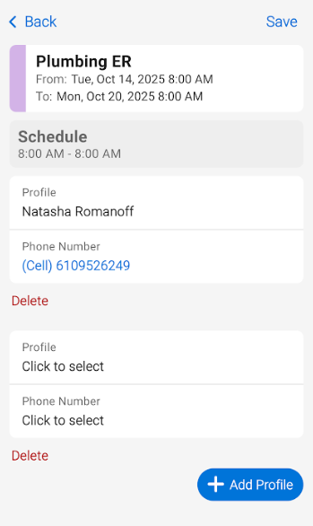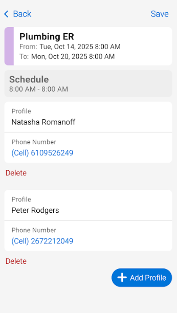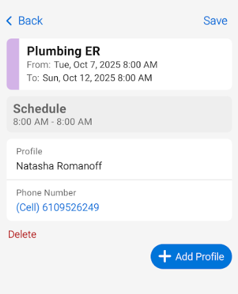 To add a Profile to an existing on-call rotation, tap the Add Profile button. To delete a Profile, tap the Delete button. To change the existing Profile, tap the Profile itself and select a new one.