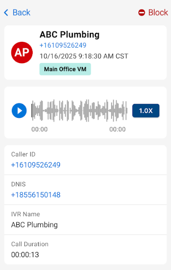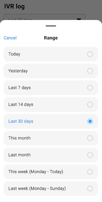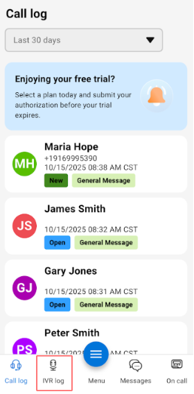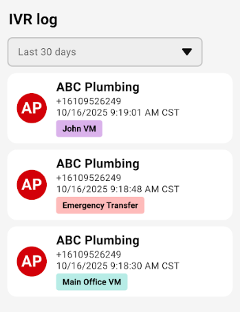 On the next screen, you'll see all IVR interactions for the last 7 days. Tap on any call to bring up the call details including the Timestamp, Outcome, Caller ID, Call Duration, and the IVR name.