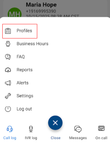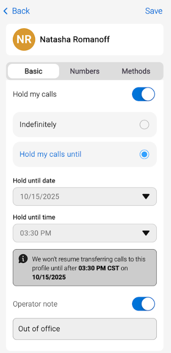 Tap on a specific Profile to bring up the details. Within the Basic tab, you can enable our Hold my Calls feature. If this feature is enabled, agents will not be able to transfer calls during the timeframe you've set. Note that this feature will only be available if you currently have a Warm Transfer step in your script.