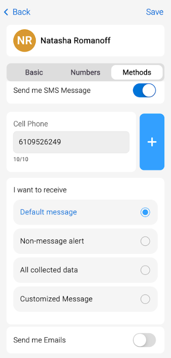 Within the Methods tab, you can update the method in which you are receiving messages, as well as the content of the messages themselves. Use the toggles to turn SMS or Email notifications on or off.