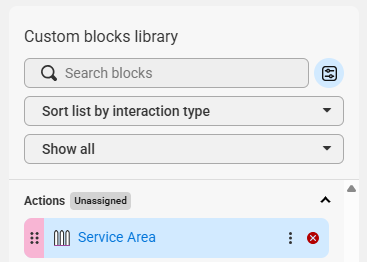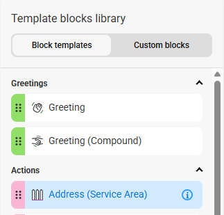 On the next page, click the Blocks tab, then select Add new block. From the Blocks list under Block Templates, locate and select the Address (Service Area) block.