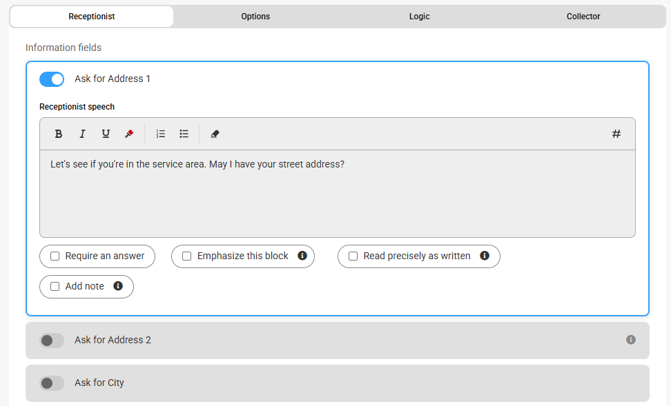 Under the Receptionist tab, use the toggles to determine the information that our agents will gather from your callers. Default text will appear, but feel free to update the text as you see fit.