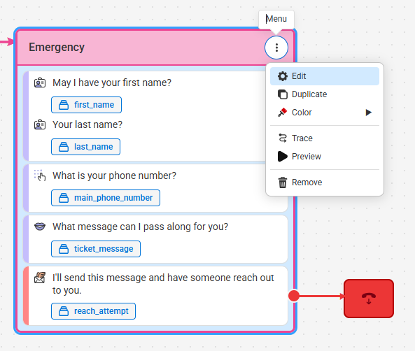 Within the script workflow, locate the script section you wish to add the Address (Service Area) block to and click the 3-dot menuicon and click Edit as shown below. In our example, we'll be adding it to our Emergency section.