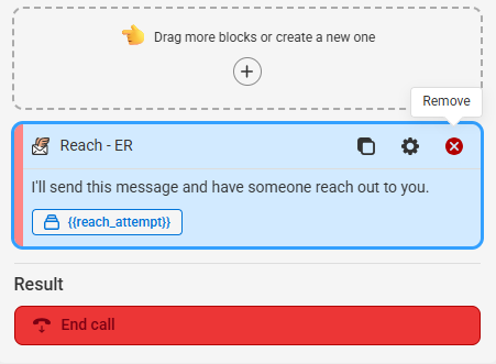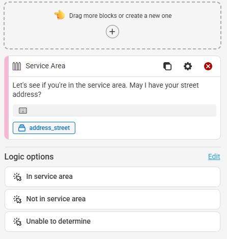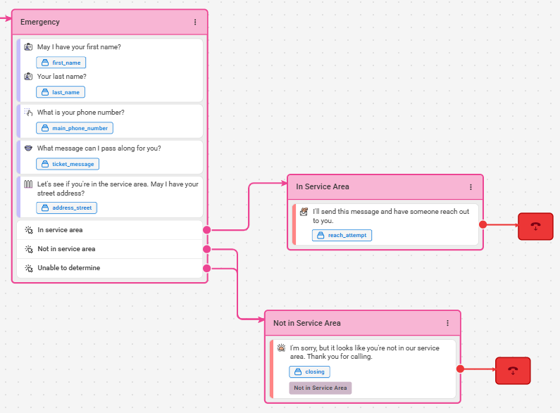 In our example, we'll create new sections based off what we want to happen for each option. If a caller is in our service area, we'll have calls result in a Reach. For callers not in our service area or if the system is unable to determine, we'll have calls result in a regular Closing. Again, depending on your needs, your next steps may differ.