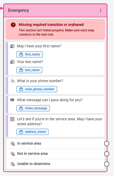 When you are done, click Save in the bottom right-hand corner. You'll be taken back to the script workflow where you'll see your newly updated section, which will now be imcomplete. To fix this, the Workflow section will need to be linked to a subsequent section or sections, as the system will need to know what to do after a selection has been made. Depending on your specific needs, this next step may vary.