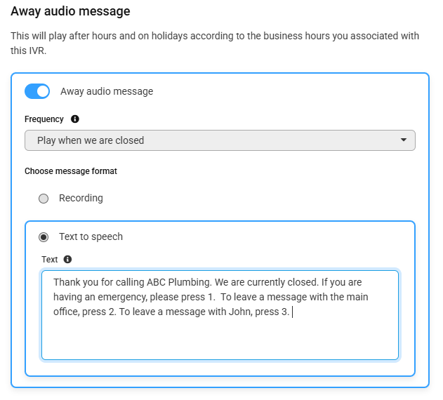 If you want a different message to play when you are closed for after hours or holidays, use the Away audio message toggle, then choose Play when we are closed from the Frequency dropdown and add your respective greeting.