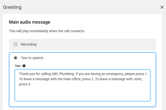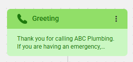All IVRs must start with a Greeting. This will be considered your "main menu" and will provide callers with subsequent options. In this example, we'll update our main IVR greeting to include an additional Voicemail option.