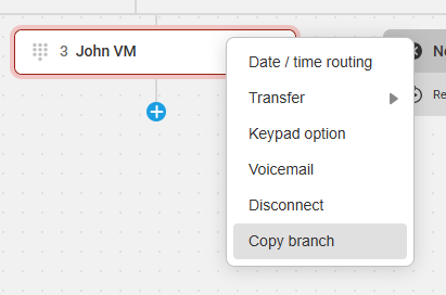 From the main IVR workflow, click the + node beneath the section you want to result in a an outside transfer. Then, select Copy branch.