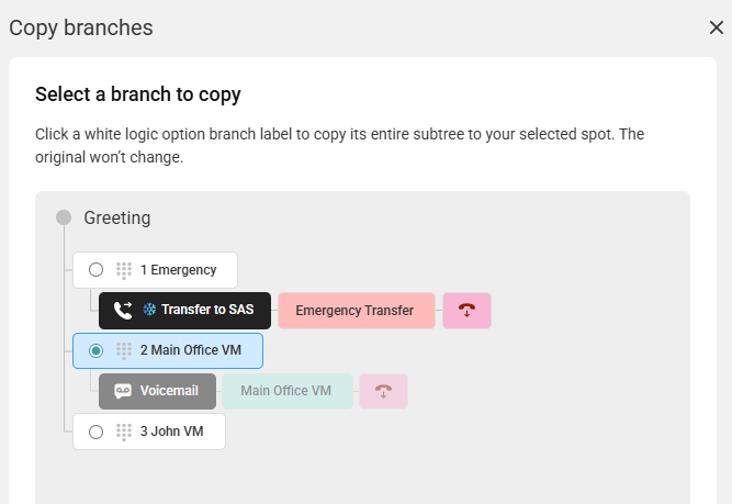 On the right side of your screen, you'll see the current IVR branches that are available to be copied. In our example, we'll choose the Main Office VM branch. Then click Copy branch.