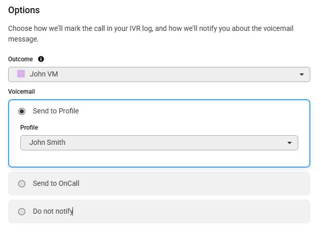 In this case, we'll change it to say John VM so that when John logs into the portal, he can easily differentiate the voicemails that are for him rather than the voicemails that are for the main office. Additionally, we'll also change the Profile in which voicemails are being sent. In this case, we'll select John's profile. When you are finished, click Save.