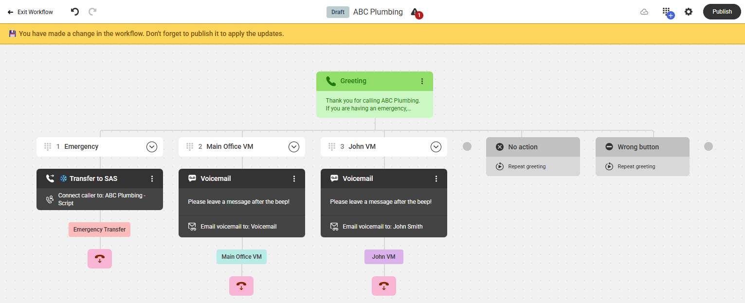 After saving, your new IVR should look something like the image below. When you are finished updating, don't forget to click Publish in the upper right-hand corner to ensure your IVR is live.