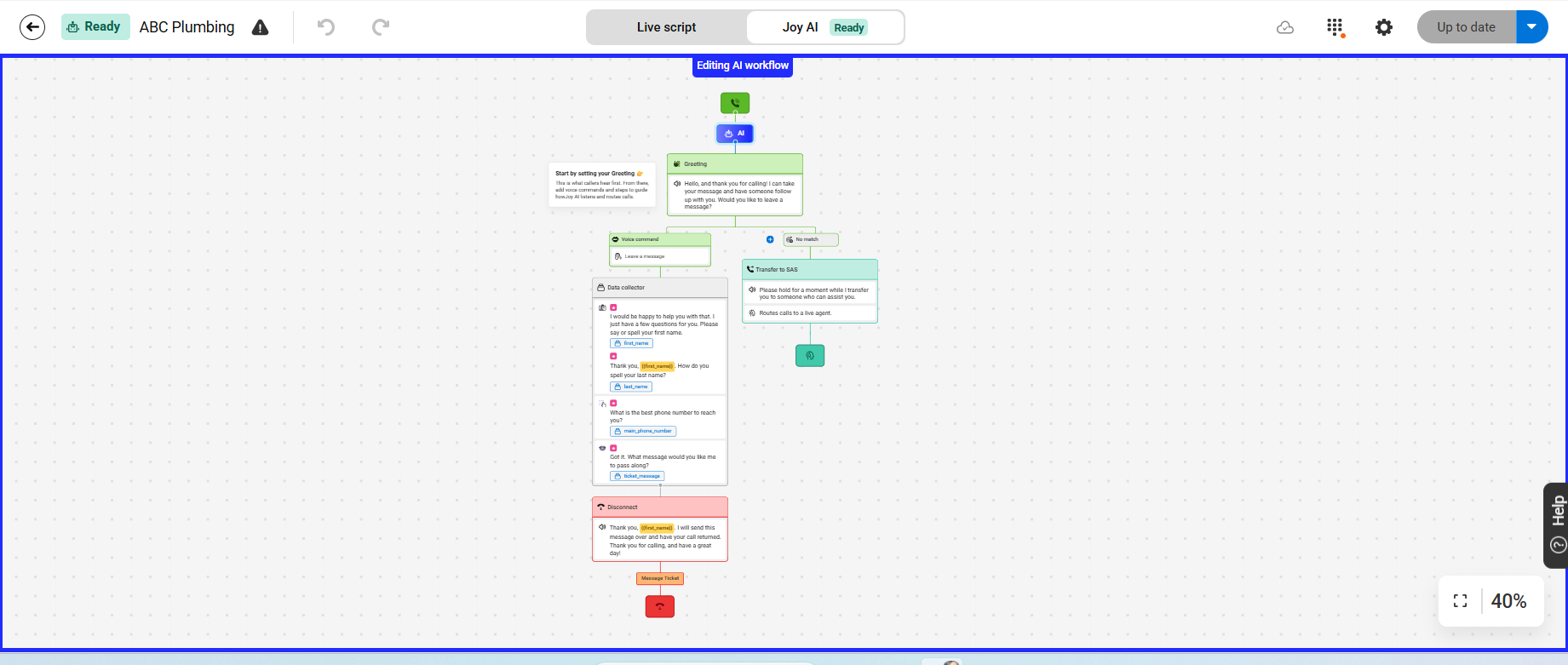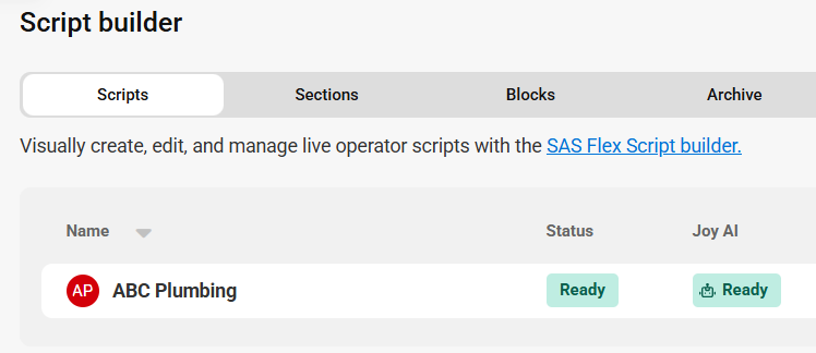 Just like a normal script SAS operators use to handle your calls, Joy follows a script as well. And, just like users can make updates in real time to their scripting, users can also make updates in real time to their Joy script via their SAS Flex portal. In this article we'll show you how to access Joy and make updates via the Joy Builder. If you haven't already activated Joy, check out this article first.