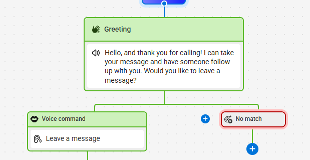 In the example above, the system is showing that the workflow is incomplete, meaning that if Joy follows that incomplete path, we won't be able to successfully handle the call. Just like a regular script, we want to make sure that all paths are complete and result in an action (a message being sent, a call being transferred, an appointment being scheduled, etc.)