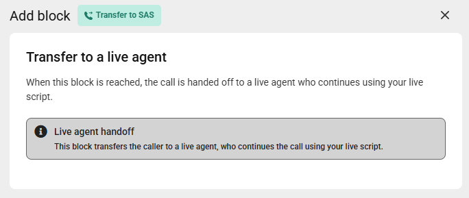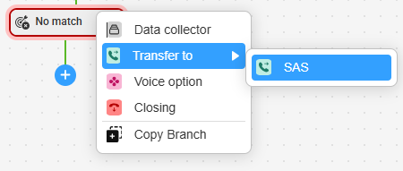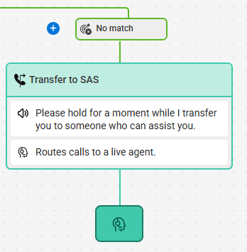 To fix this error, click on the blue + sign underneath the incomplete path to add an action. Depending on what you want the system to do, you'll choose the applicable option. In this example, we want No Match calls to result in a transfer to a live agent.