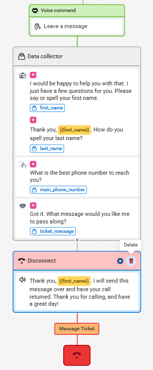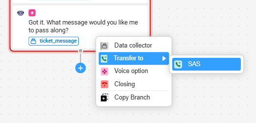 Currently, our main path has Joy collecting basic information from callers and then sending a message through. In this tutorial, we will remove the current Closing option and replace it with a Transfer to Agent option instead.