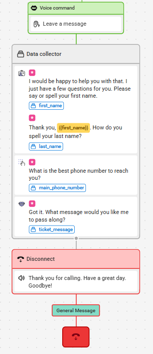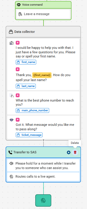 Currently, our main path has Joy collecting basic information from callers and then transferring the caller to an SAS agent. In this tutorial, we will remove the current Transfer option and replace it with a Closing option instead.
