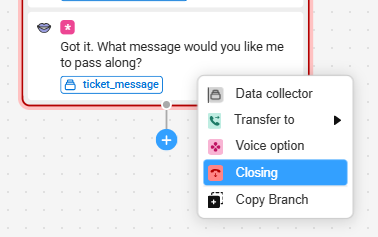 Closing blocks within Joy AI operate in much the same way that Closing blocks in the regular script builder do. Users are able to choose an Outcome, control where messages are sent, initiate a Reach On-Call, or integrate with one of our many available apps.