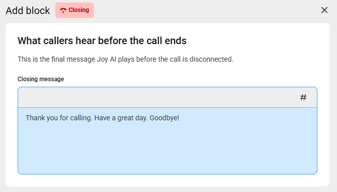A bump out will appear on the right-hand side of your screen which will allow you to configure your closing. The Closing message text box will be what Joy reads to your callers. You can change the default text or leave it as is.