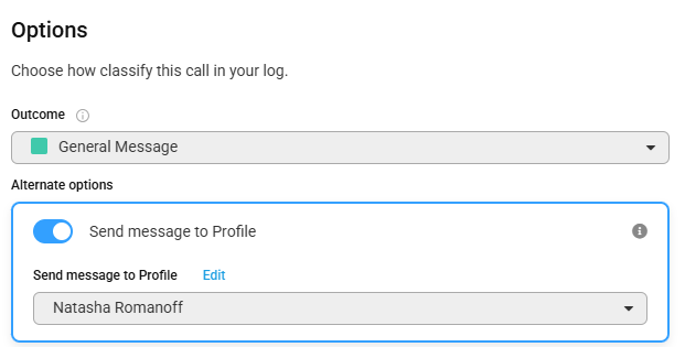 Under the Options section, assign a Call Result to your Closing block by choosing an Outcome. Then choose the Profile(s) you want messages to be sent to. You can select up to 10 Profiles per Closing block.