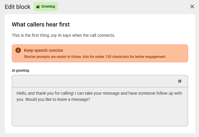 A Greeting block allows a user to customize how Joy AI will greet their callers, and will determine the flow of the call. A Greeting can be as simple as asking the caller if they want to leave a message, or it might also include driving questions that will route the call one way or another. Callers will hear any recorded greeting or IVR prompts up front, and then they'll be greeted by Joy.