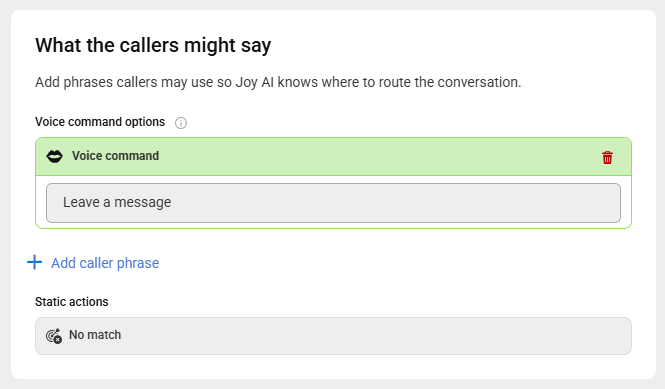 Below the main greeting text, you can words or phrases that callers may use which will help guide Joy AI in how to route the conversation. By default, the "Leave a message" voice command will already be there, but you can click Add caller phrase to add more.