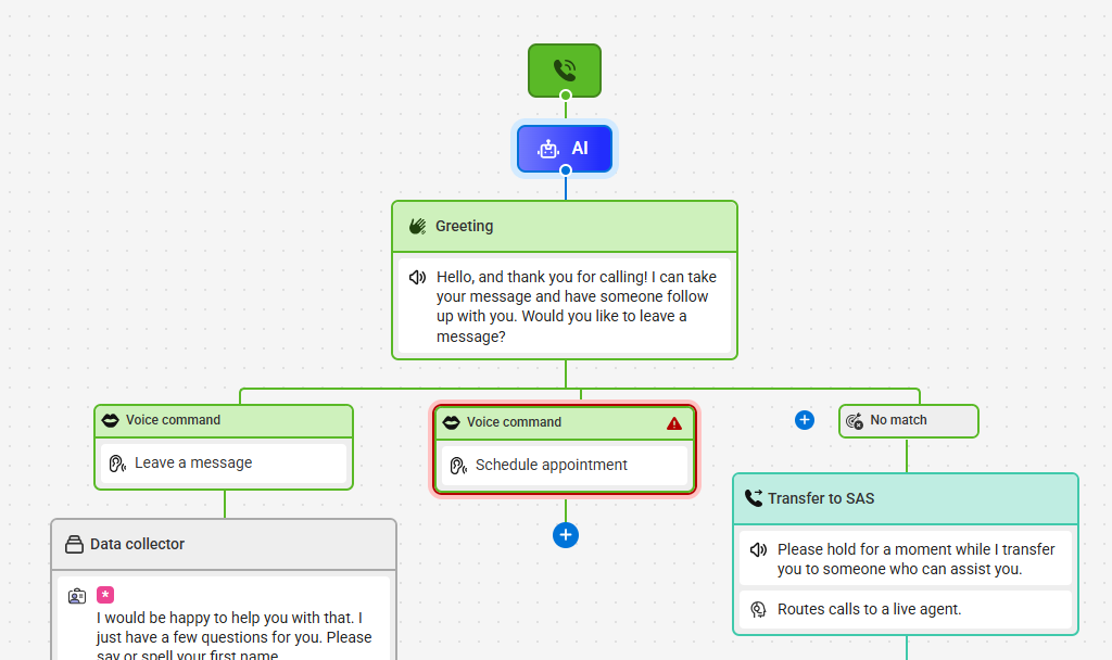 If you decide to add more caller phrases, then each phrase will create it's own new pathway in the builder, as shown below. Each new pathway will need to be completed by adding data collectors, transfers, a closing, or additional voice commands.