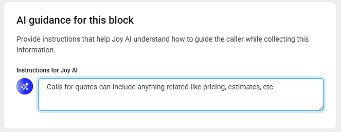 Back in the Greeting block, you can add instructions that help Joy AI understand how to guide the caller while collecting information. For example, if your main greeting is asking customers if they're calling for a quote, callers may respond with other words like "pricing" or "estimate" which may confuse the system. To help make sure Joy is handling the call as efficiently as possible, you could add the following message: